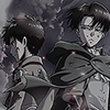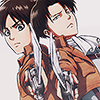 Description: shingeki no kyojin; eren and levi back to back, blades raised in unison